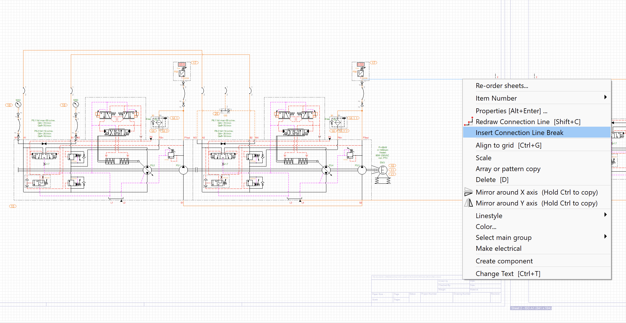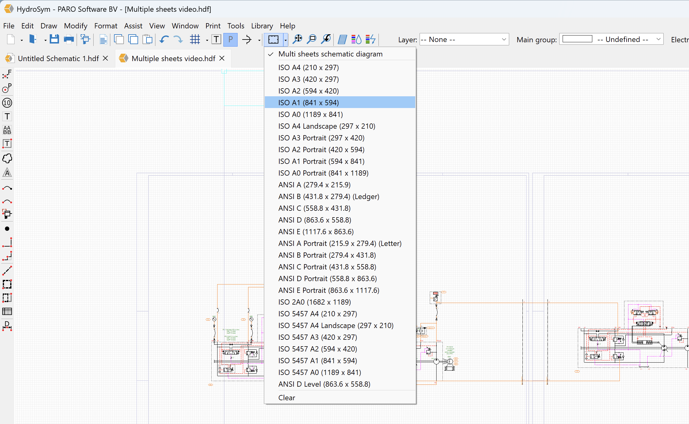 In HydroSym, you can work in a free drawing space or within a predefined paper size. To utilize multiple sheets within a single project, you must select a predefined paper size (e.g., ISO A1) within your drawing area.