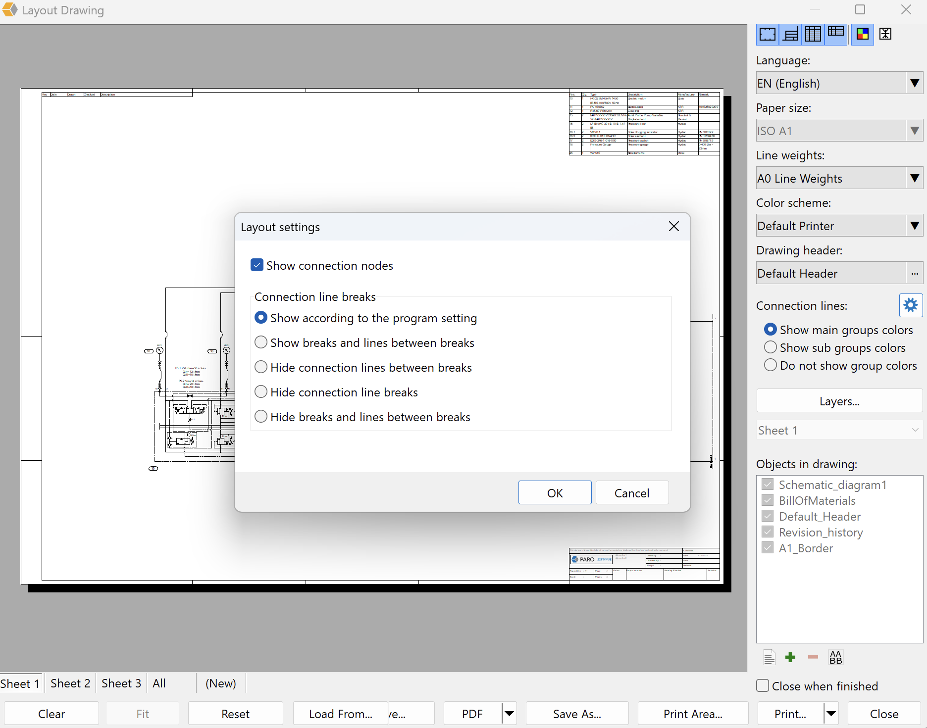 - Layout Settings Dialog: Access this to toggle "Show connection nodes" or manage "Connection line breaks." Available options include: